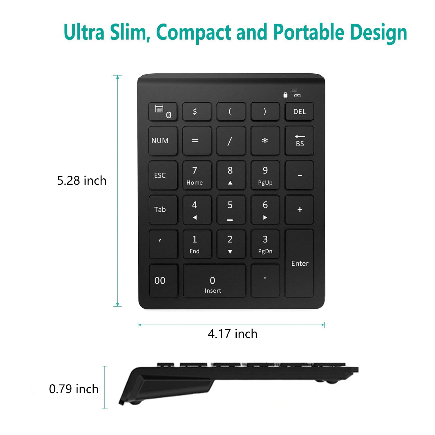 ✔ ERGONOMIC AND POWER SAVING: pads on back provide optimum comfort and securely keep the bluetooth numpad in place. It will auto power-saving mode when not in use for 15 minutes, press any key can wake up within 3 seconds