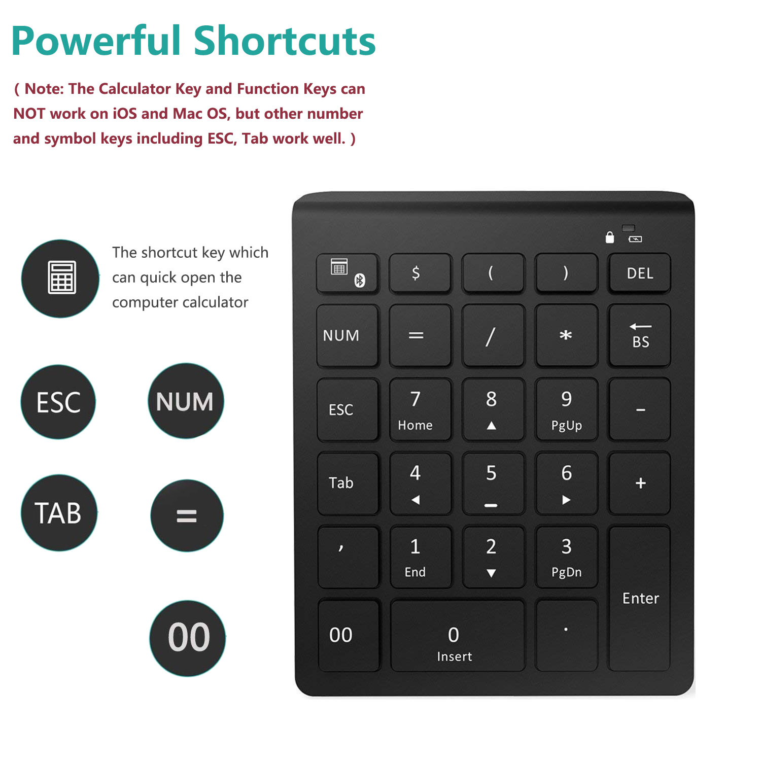 ✔ COMPATIBILITY :Widely Compatible with Windows 2000/ Me/ 98/ XP /Vista/ 7/ 8/10, Android, Samsung, Surface Pro 3, Pro 4, Android Cellphone Tablet PC Laptop Desktop etc. ã€NOTE: This number pad is NOT completely compatible with Macbook OS system and Apple iPad iPhone iOS system, Calculator Key and Functional Keys can not work but other number and symbol keys ESC, Tab work well 】